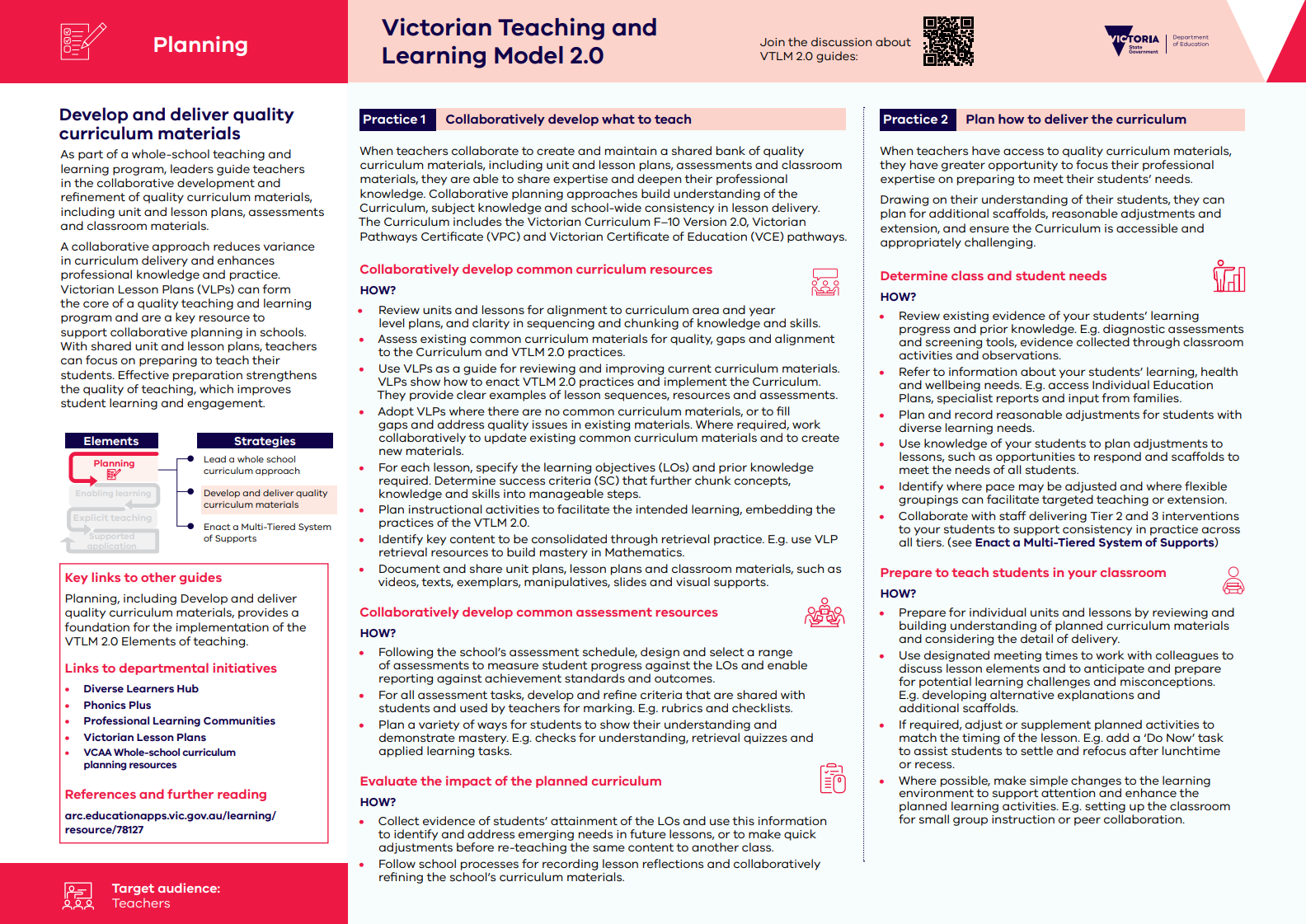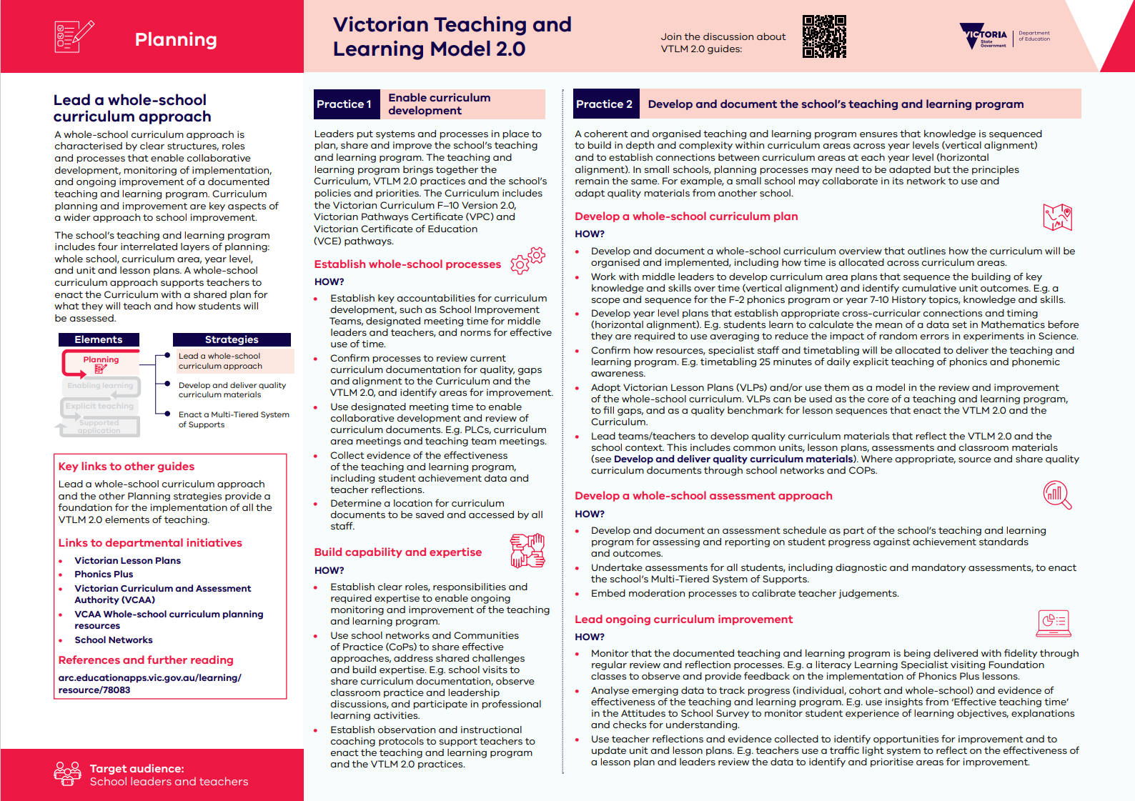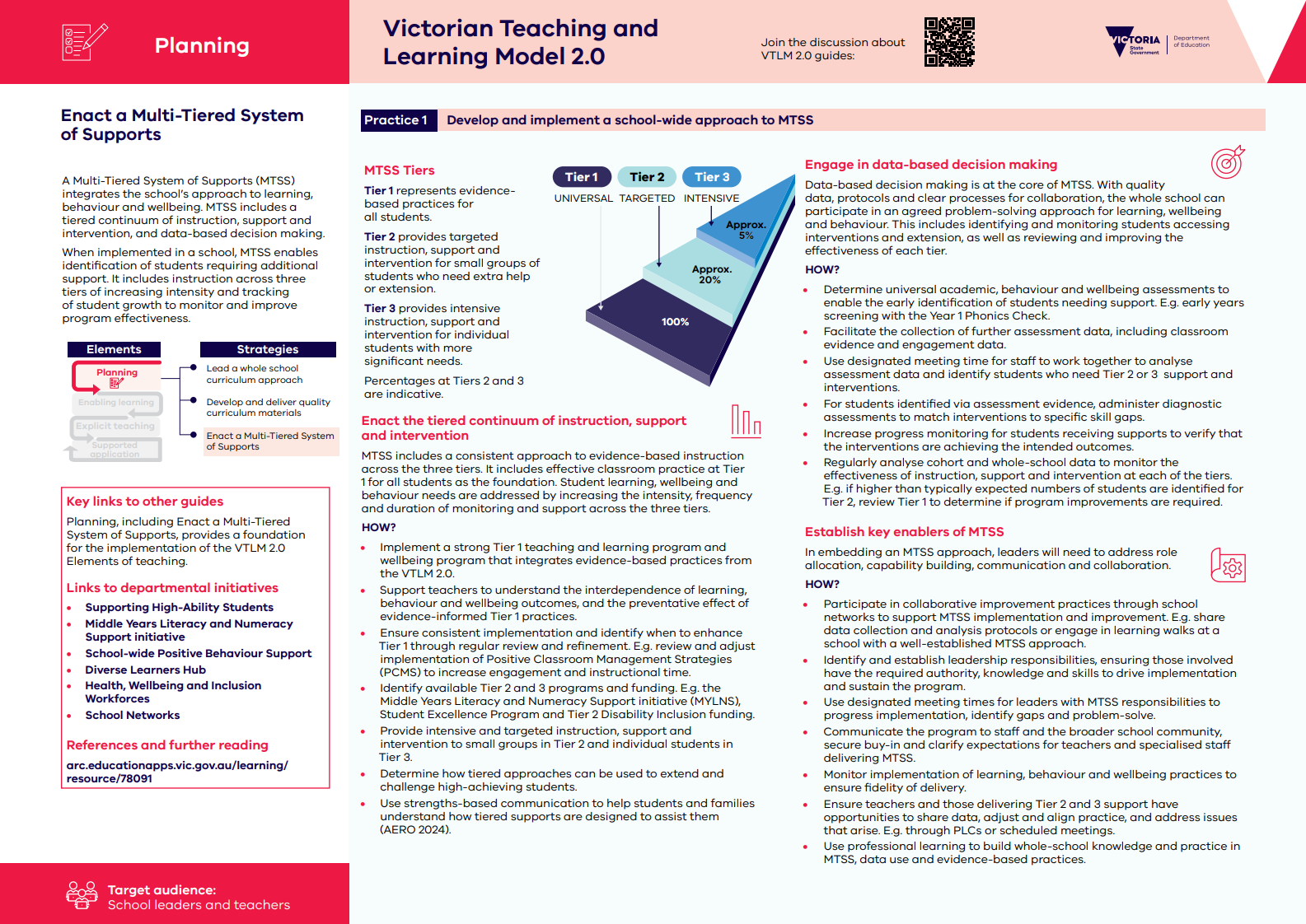 The VTLM 2.0 introduces an emphasis on the evidence about how students learn as the basis for effective teaching. It provides increased clarity for teachers about the elements of teaching that have the strongest evidence base. The VTLM 2.0 links to best practice approaches from existing frameworks that contribute to effective student wellbeing and classroom management, such as the Positive Classroom Management Strategies (PCMS).